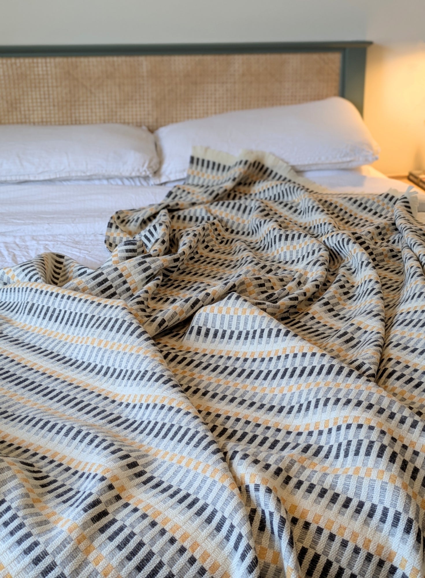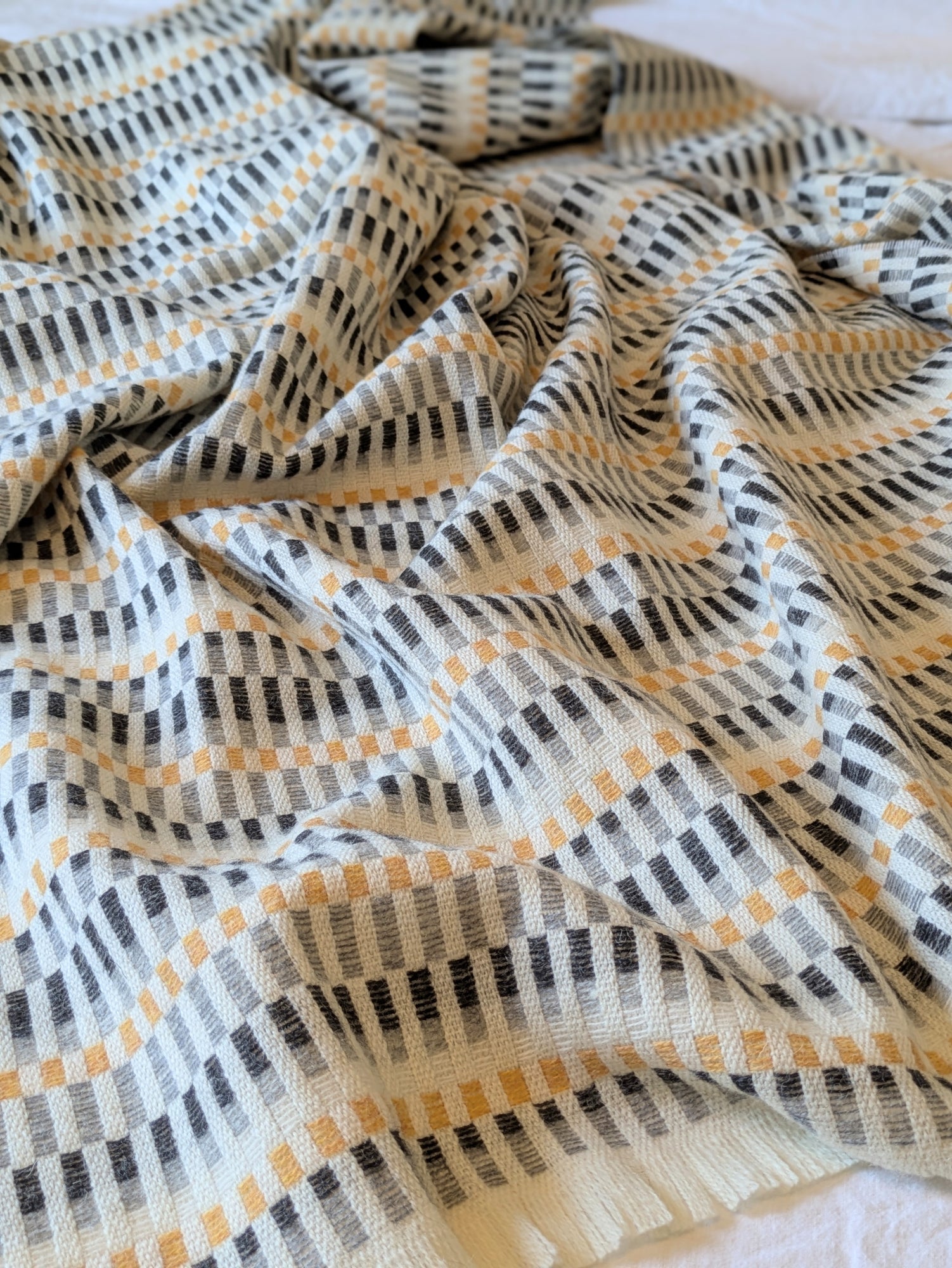 A soft, fine and cosy lambswool throw with a subtle block pattern in greys, neutrals and sunshine yellow These blankets are created with suitability at the forefront of our minds - the wools are a mix of British undyed yarns as well as deadstock merinos that would have made their way into landfill.