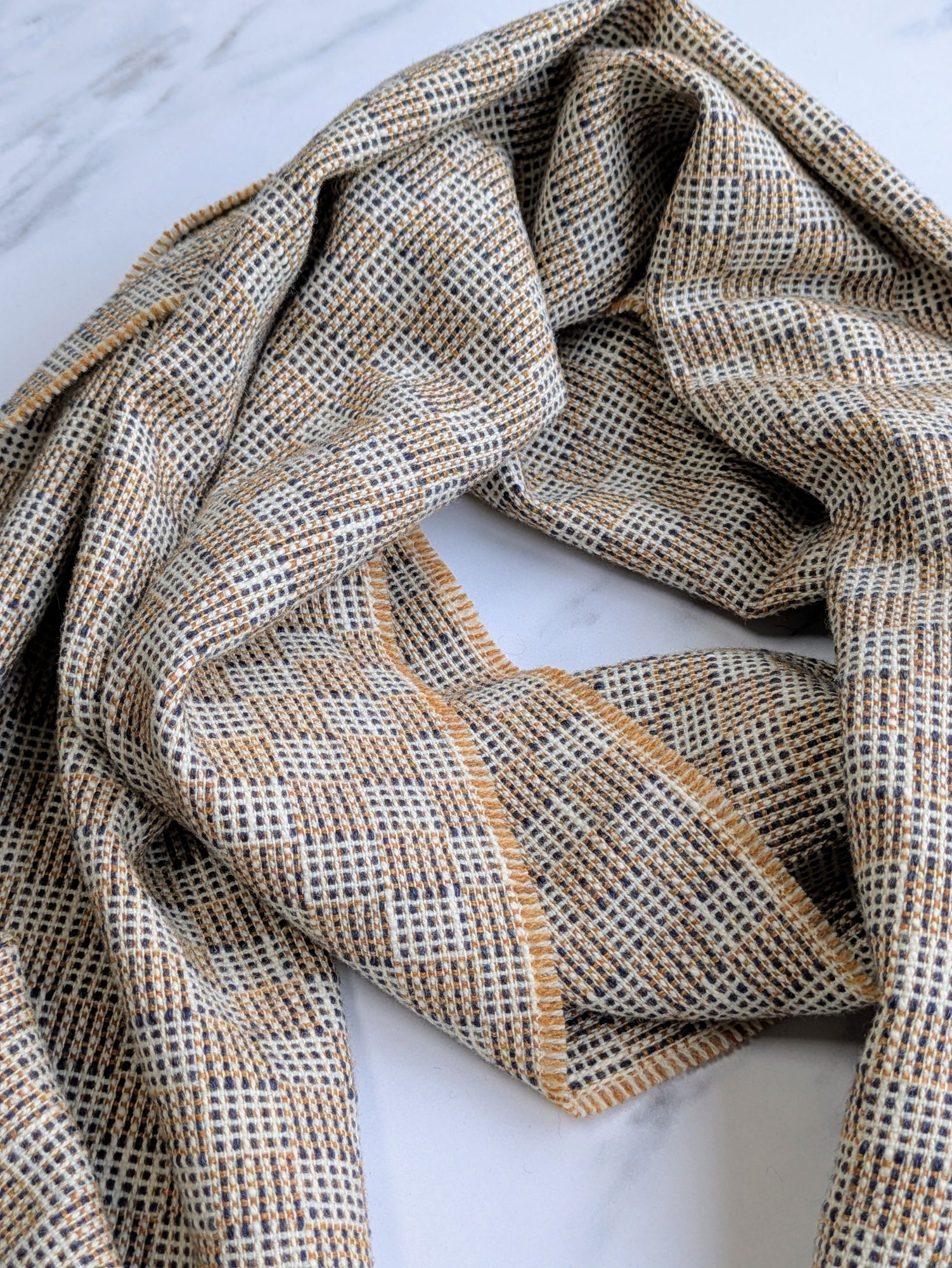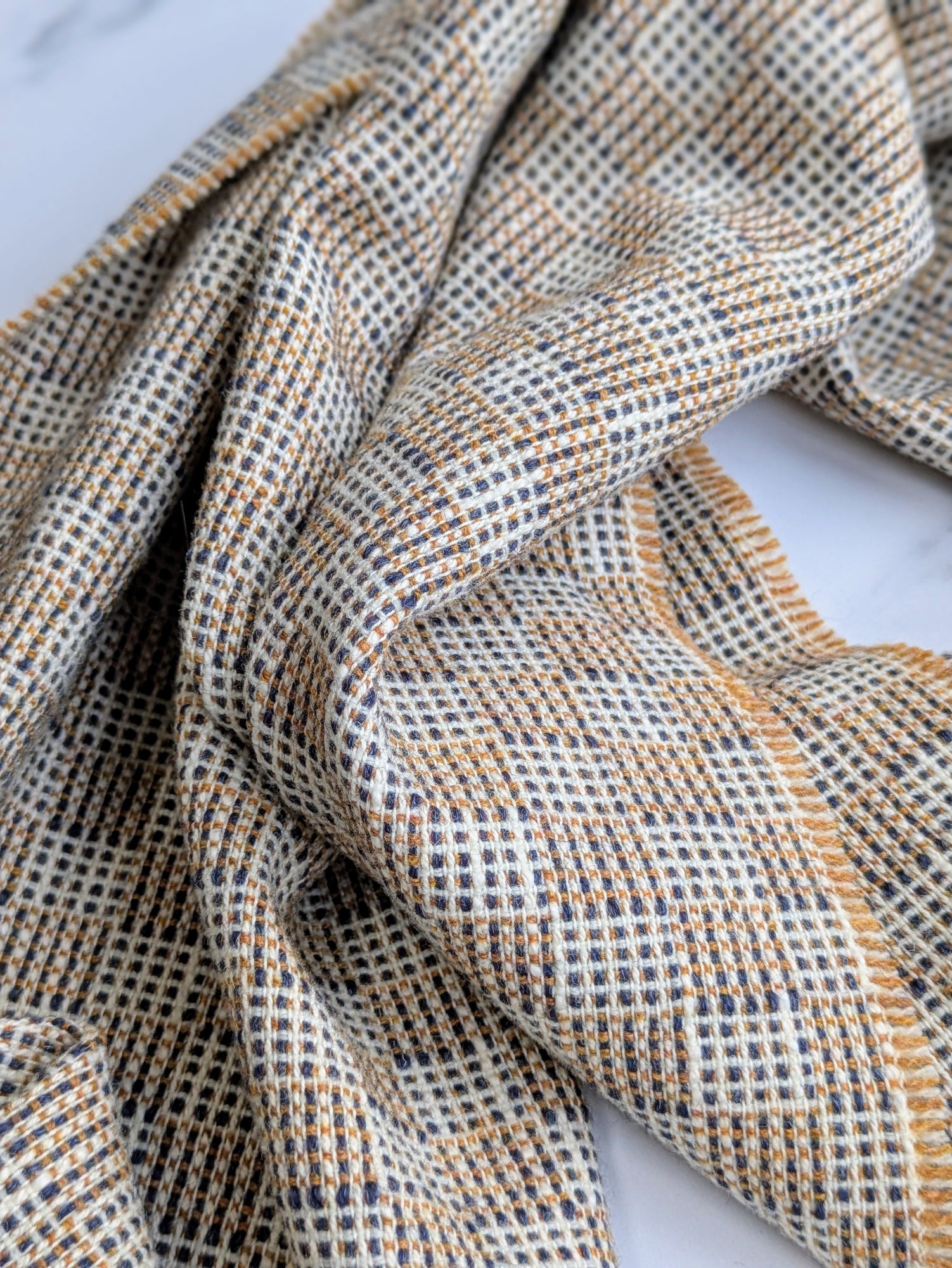 A soft, fine and cosy lambswool and cotton scarf with a striking block pattern. These blankets are created with suitability at the forefront of our minds - the yarns are a mix of British yarns as well as deadstock that would have made their way into landfill.