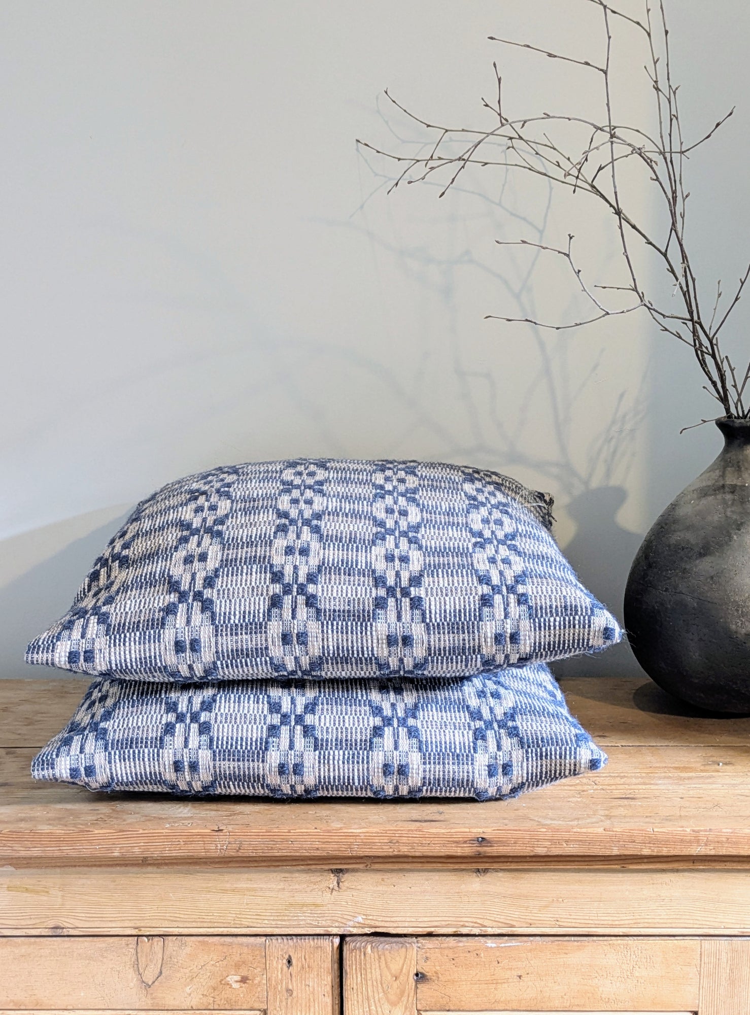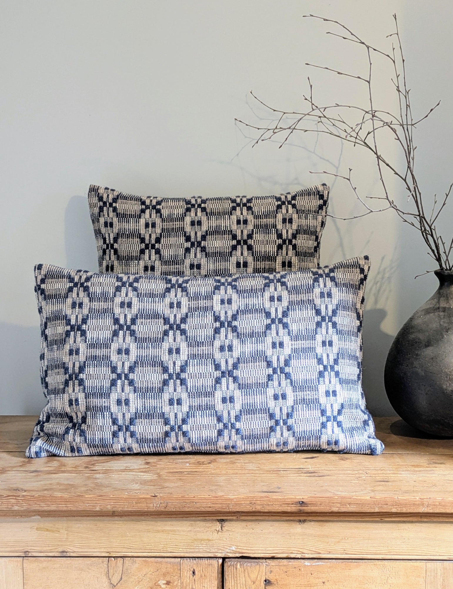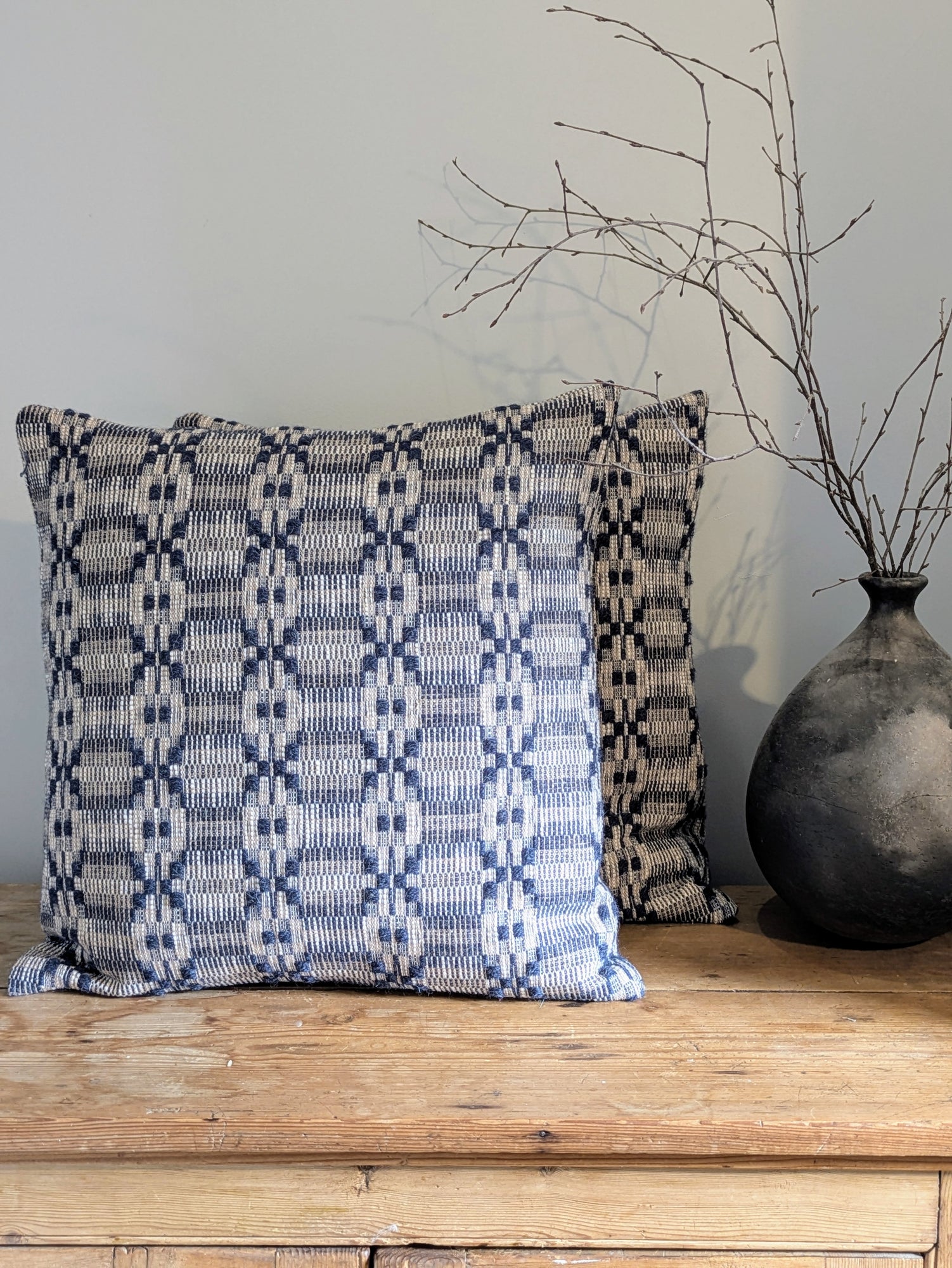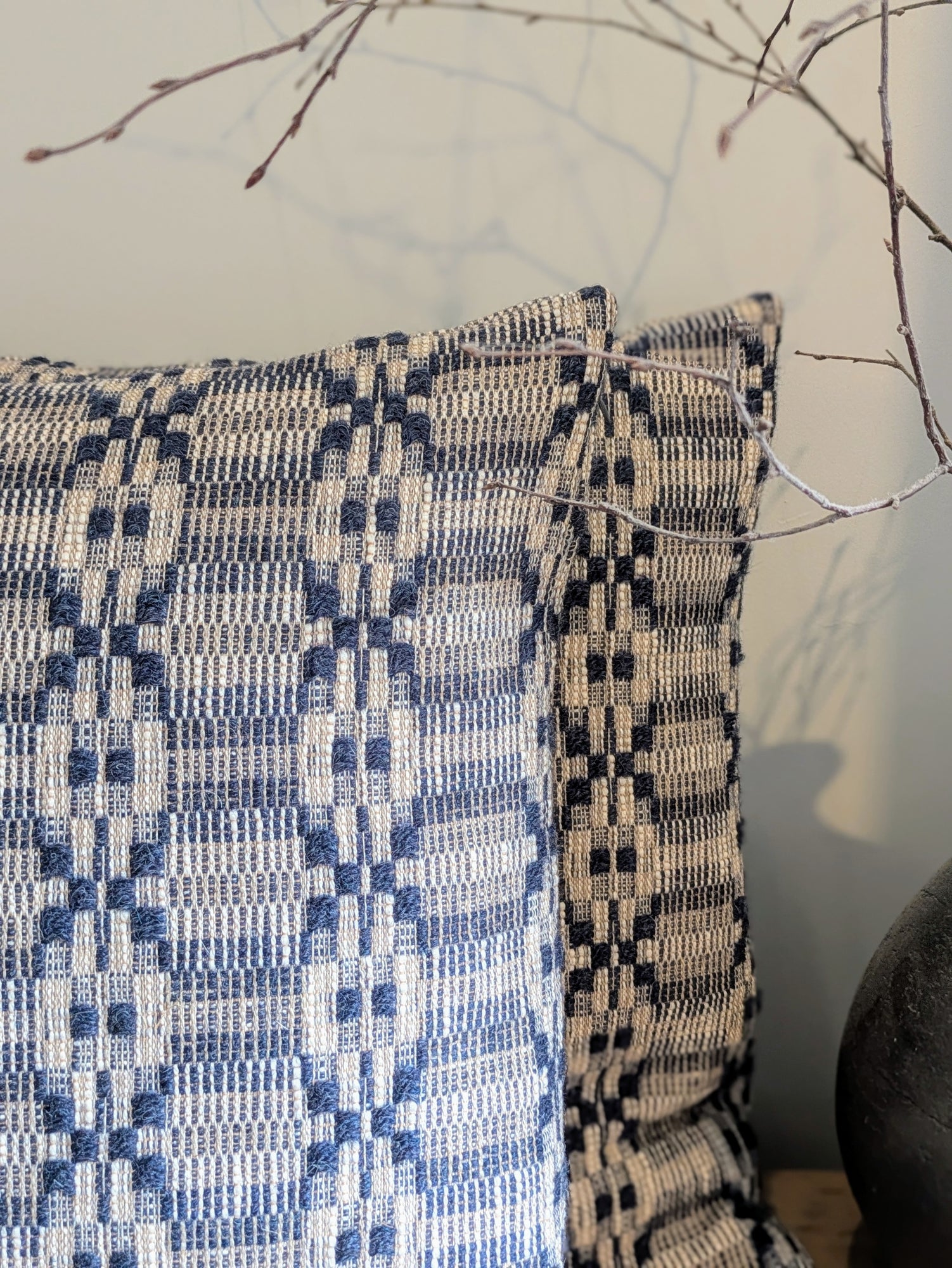A soft, fine and cosy lambswool, cotton and linen zipped cushion with a striking traditional overshot pattern. These cushions are created with suitability at the forefront of our minds - the yarns are a mix of British yarns as well as deadstock that would have made their way into landfill.
