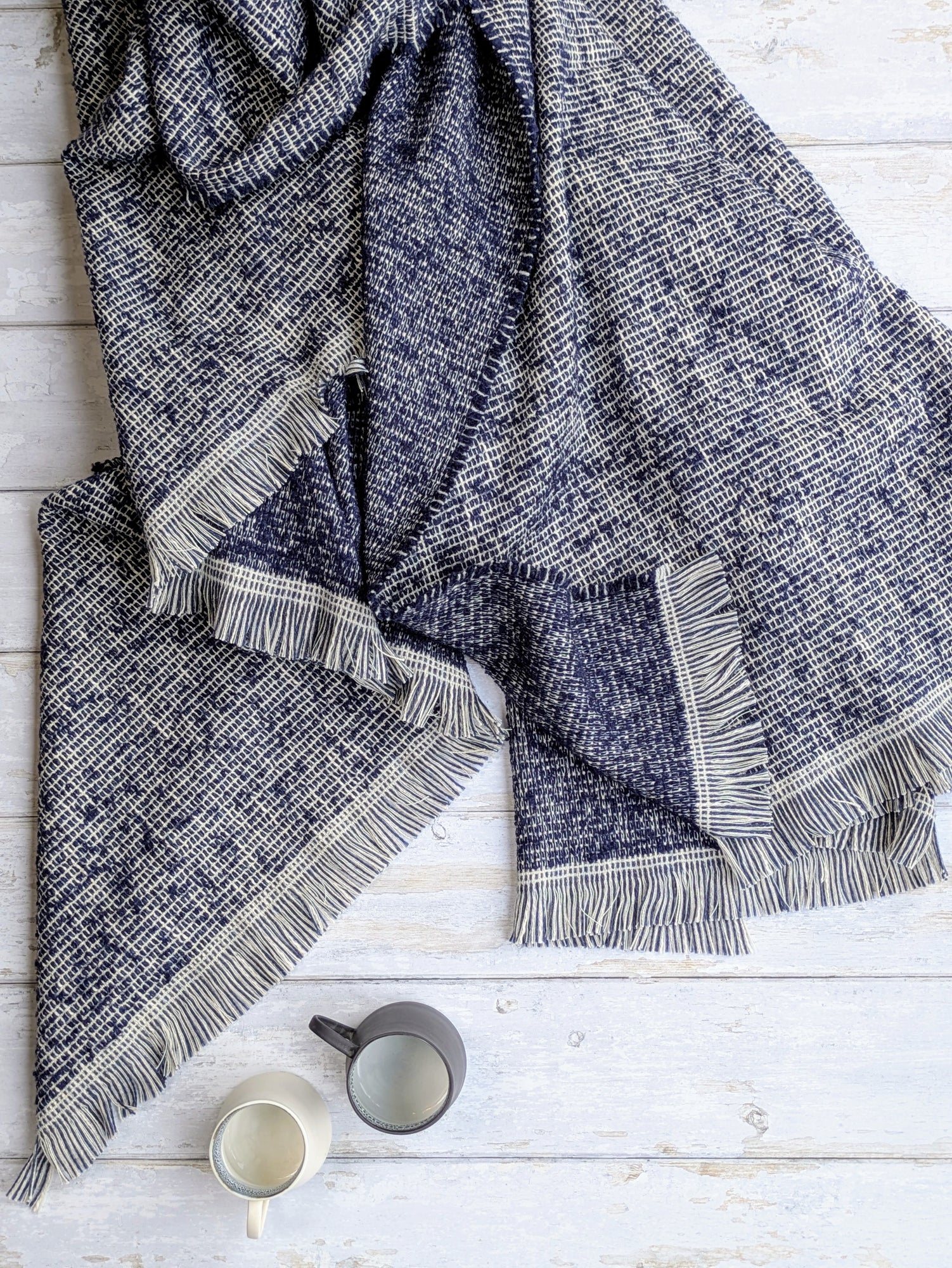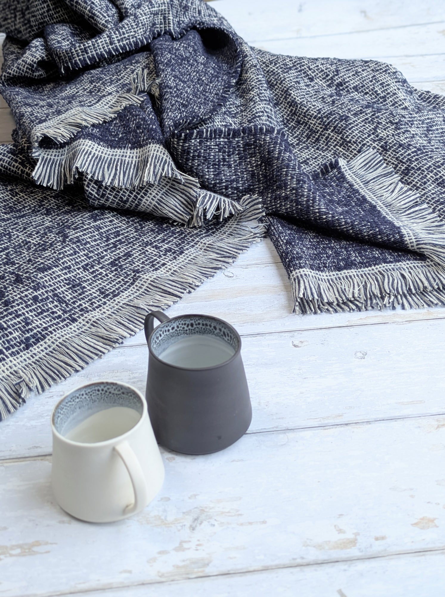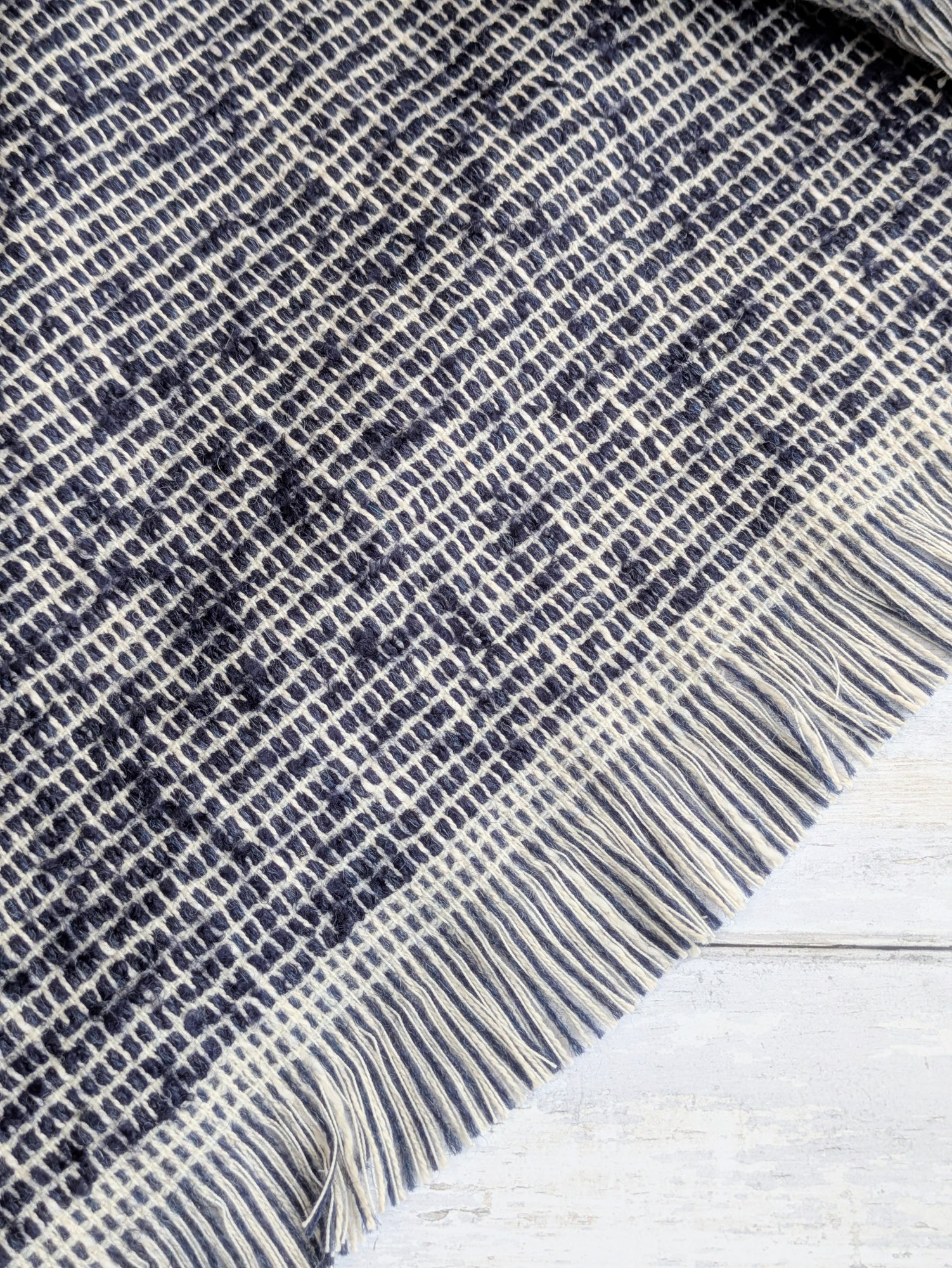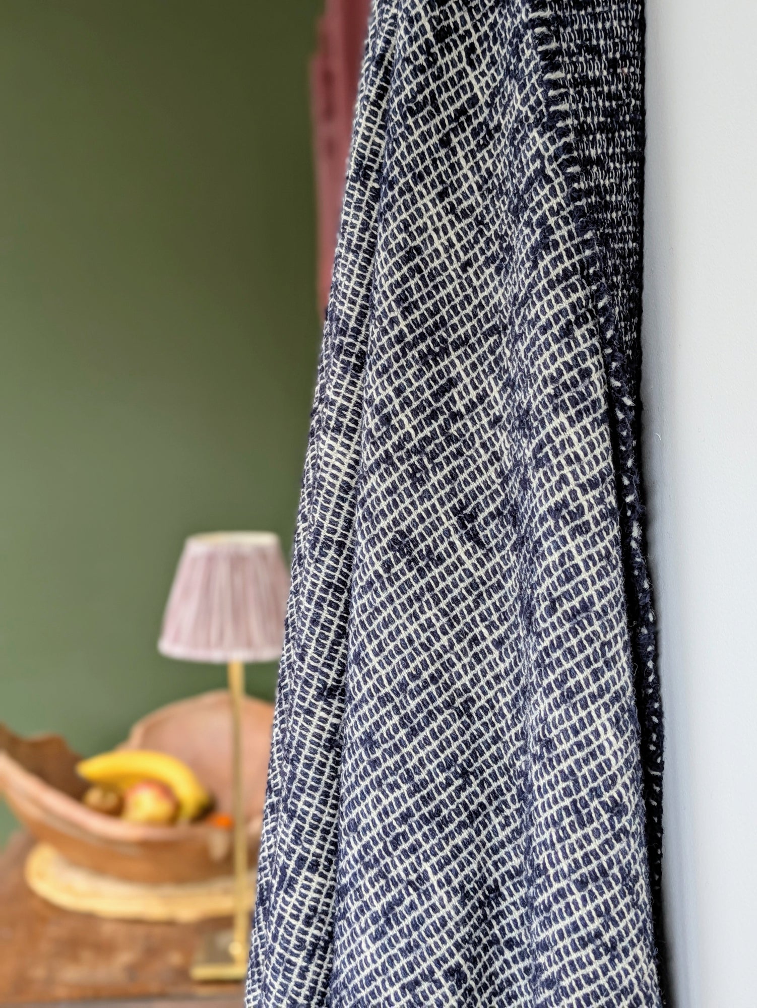 A super soft and fluffy lambswool, wool/alpaca boucle and cotton blanket with a striking block weave pattern. These blankets are created with suitability at the forefront of our minds - the yarns are a mix of British yarns as well as deadstock that would have made their way into landfill.