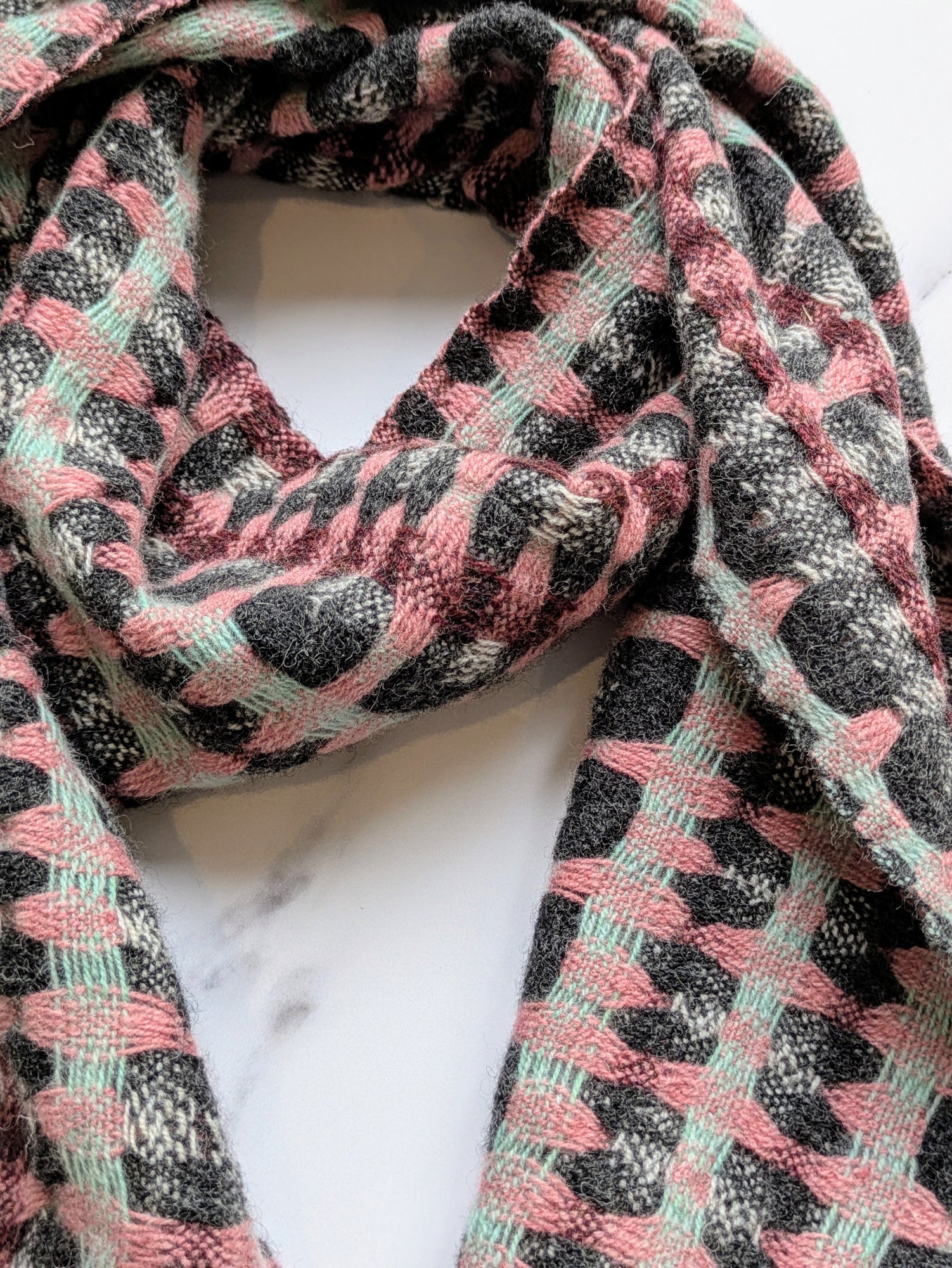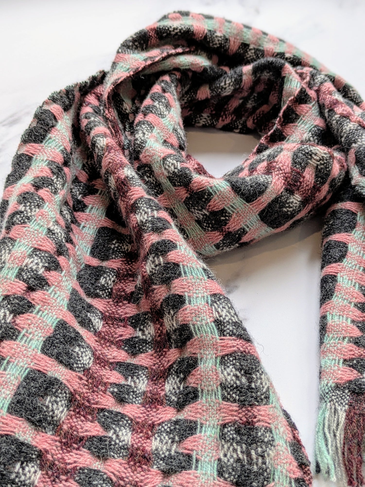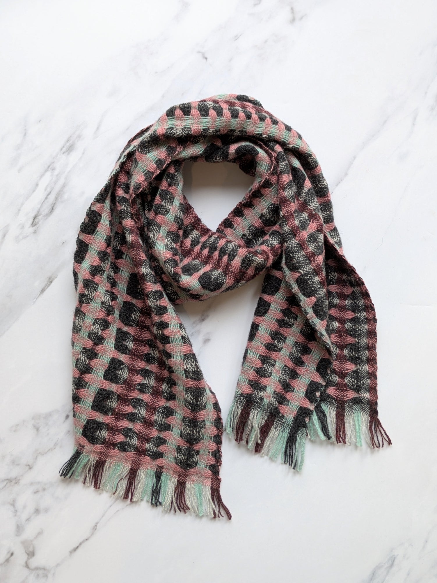 An extra soft and cosy merino scarf with a striking and intricate deflected doublecloth pattern. This scarf is a great wardrobe staple for both men and women and is reversible for extra versatility!