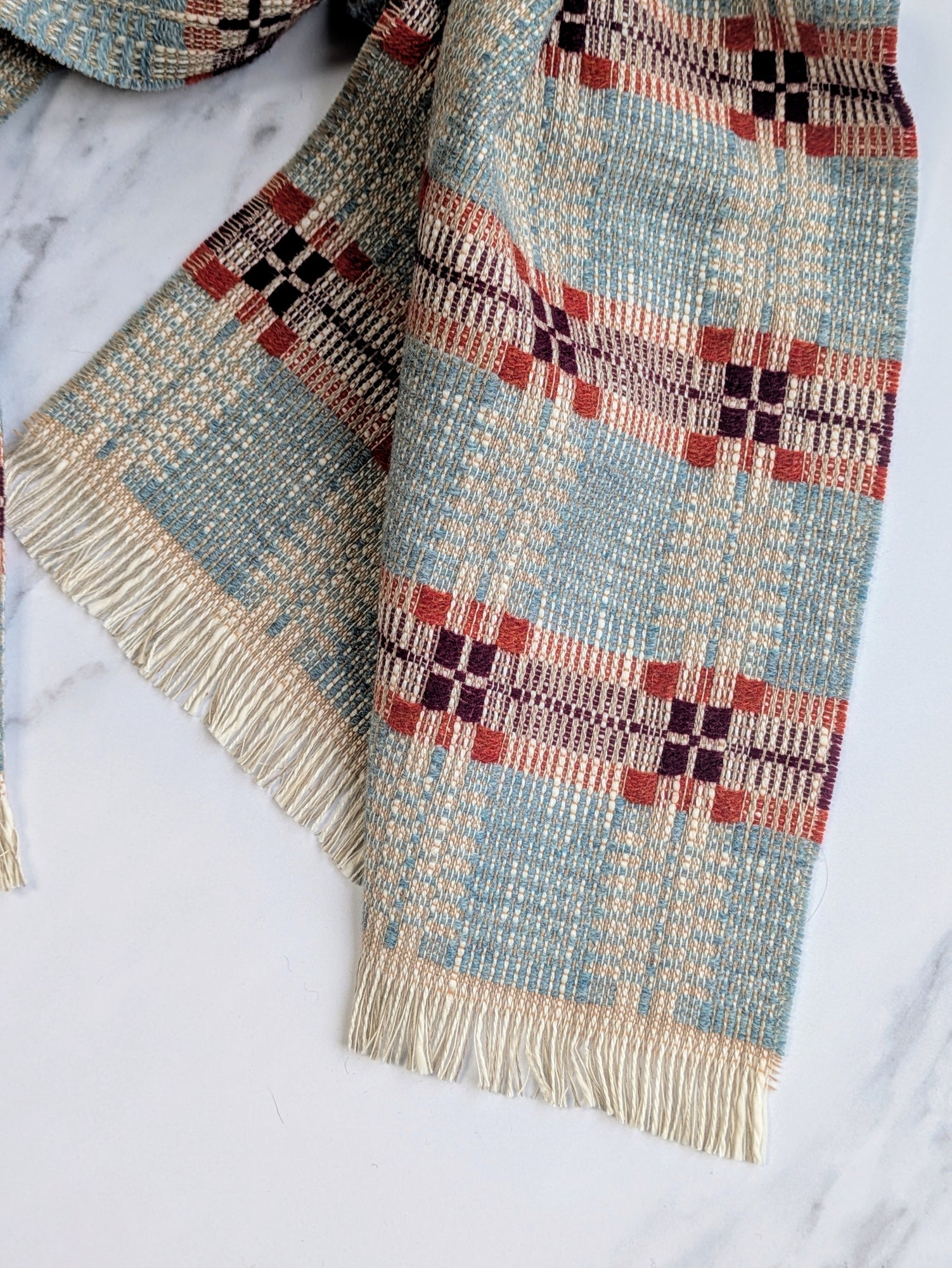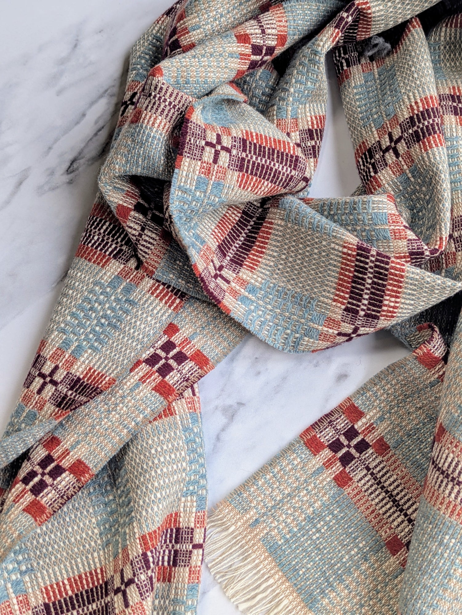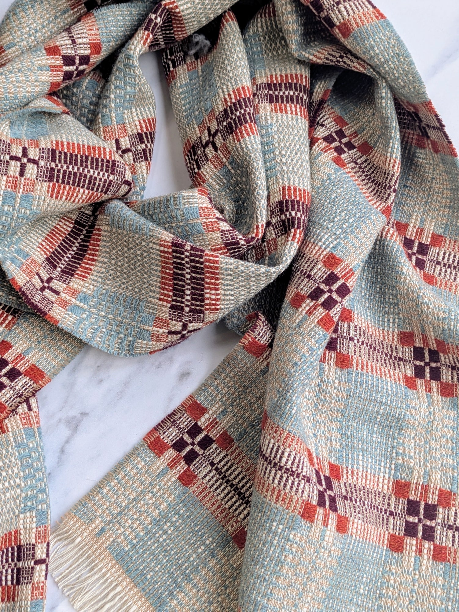 A soft, fine and cosy lambswool, cotton and linen scarf with a striking traditional overshot pattern. These blankets are created with suitability at the forefront of our minds - the yarns are a mix of British yarns as well as deadstock that would have made their way into landfill.