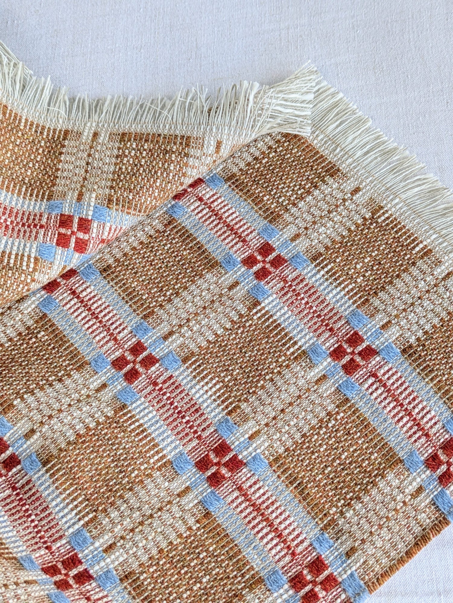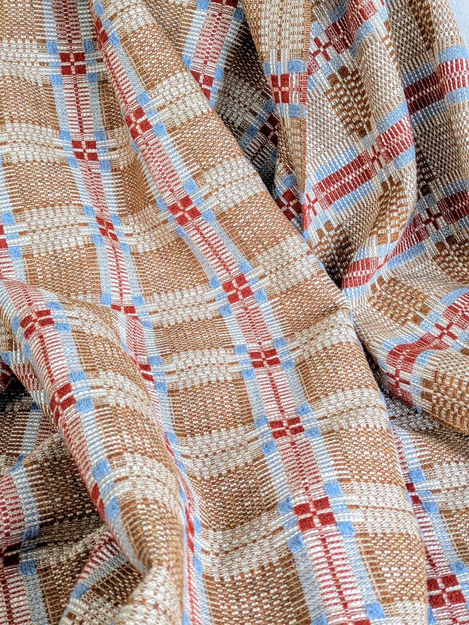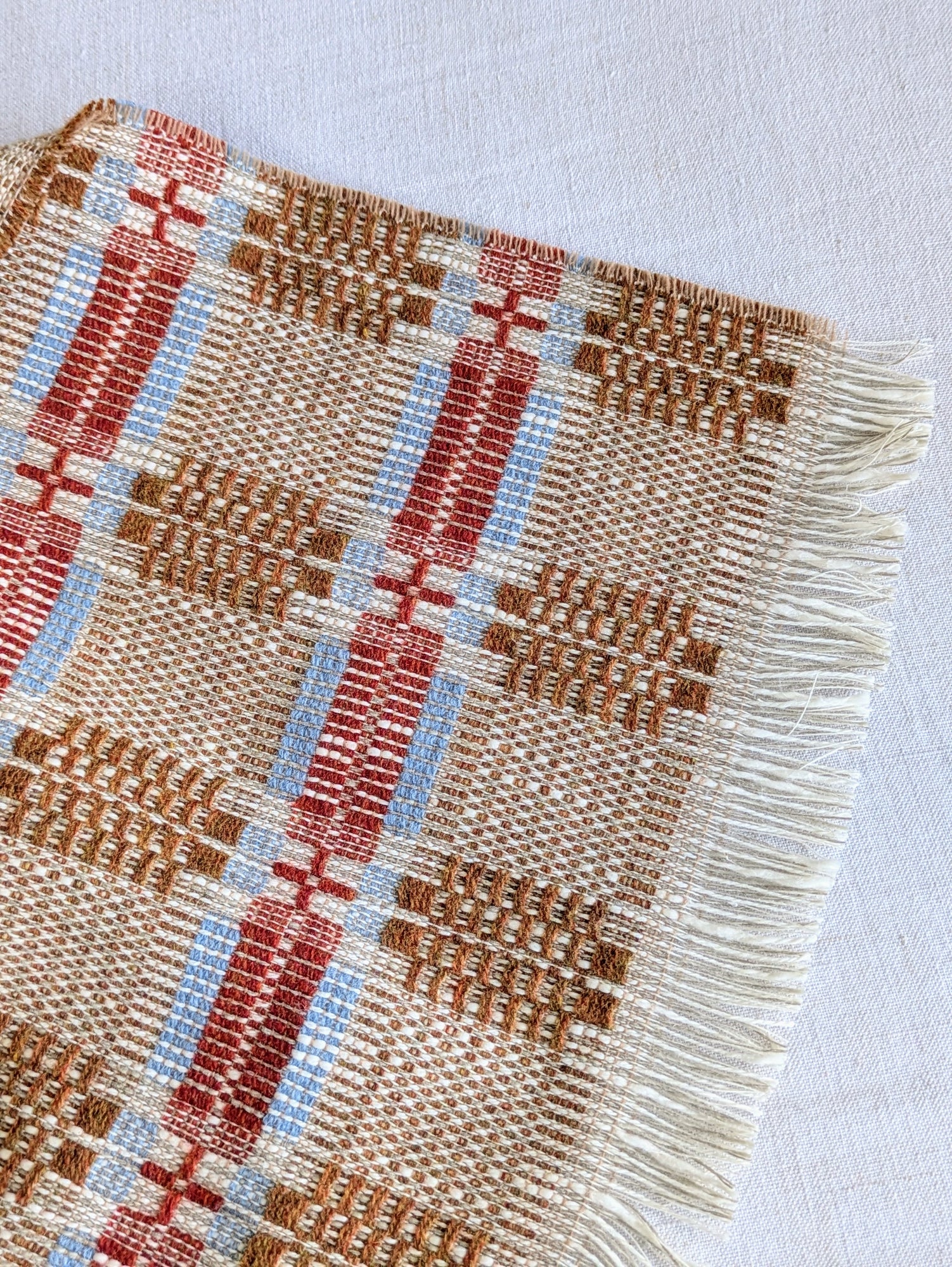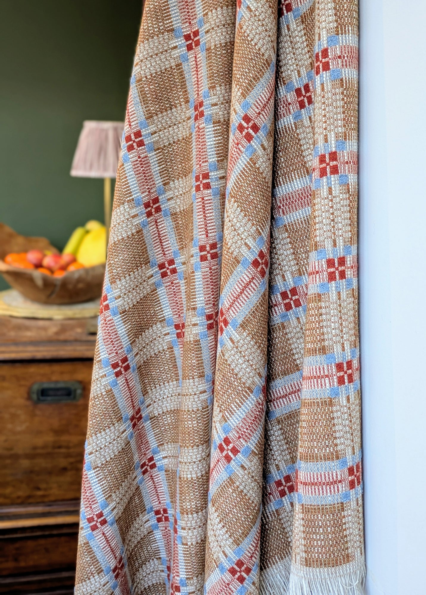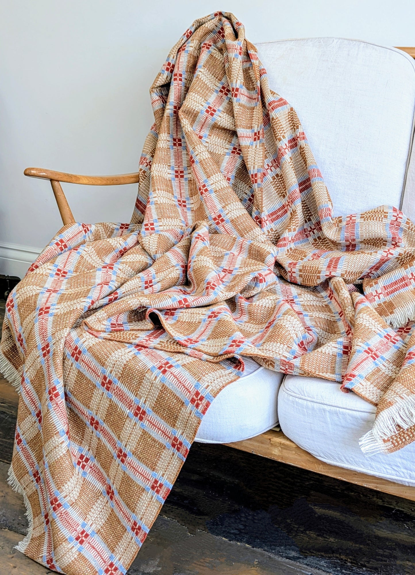 A soft, fine and cosy lambswool, cotton and linen blanket with a striking traditional overshot pattern. These blankets are created with suitability at the forefront of our minds - the yarns are a mix of British yarns as well as deadstock that would have made their way into landfill.